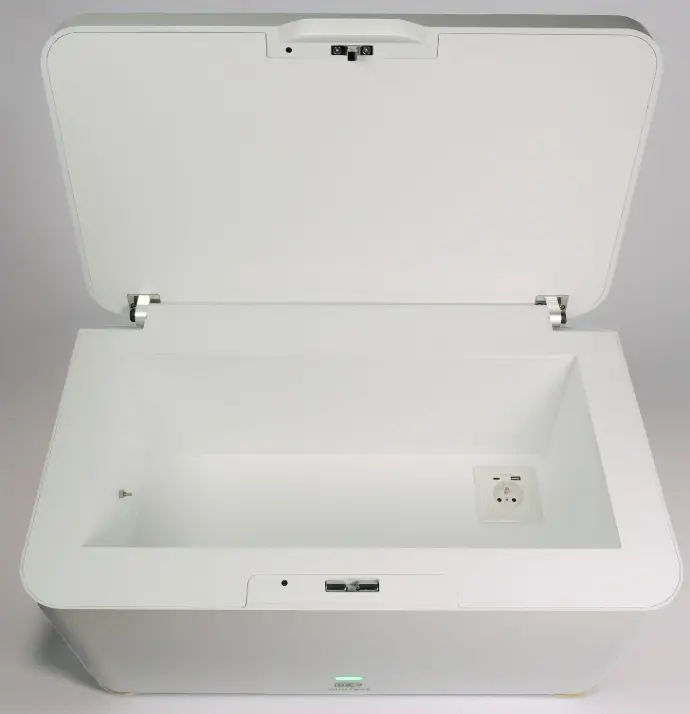 L'ouverture du coffre se fait par le dessus. Vous ne pouvez donc pas poser d'objet dessus. Cela empêche aussi de l'encastrer dans des meubles de cuisine.