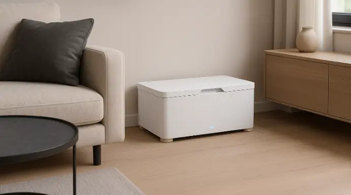 L'ouverture du coffre se fait par le dessus. Vous ne pouvez donc pas poser d'objet dessus. Cela empêche aussi de l'encastrer dans des meubles de cuisine.